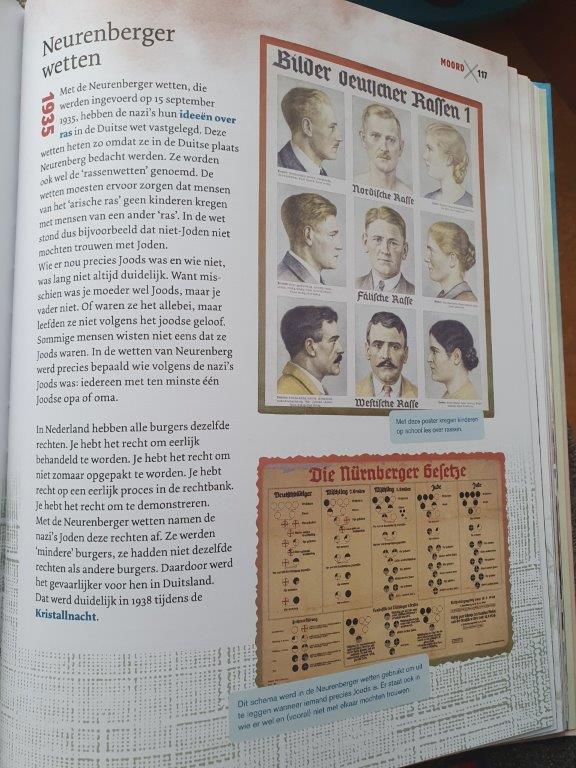 Nu is oorlog natuurlijk verschrikkelijk. Er zijn genoeg foto’s die een kind (of volwassene) nachtmerries kunnen bezorgen. De makers van Toen het oorlog was, hebben ervoor gekozen om de ergste beelden niet in dit boek op te nemen. Achterin staat een hele verantwoording waarin ook dit staat uitgelegd. Zelf vind ik dat een voorbeeld van je doelgroep serieus nemen. Het taalgebruik, de manier waarop Toen het oorlog was is ingedeeld en de foto-keuze geeft aan dat ze niet een boek klakkeloos met feiten en foto’s hebben gepropt, maar echt hebben nagedacht over wat kinderen van groep 8 zouden aankunnen qua leesniveau en (bij gebrek aan een betere uitdrukking) empathisch historisch vermogen. De pagina over de Neurenberger-wetten, waarin institutioneel anti-semitisme wordt uitgelegd, is één van de besten die ik ooit heb gezien. Zowel in boeken voor volwassenen als die voor kinderen!