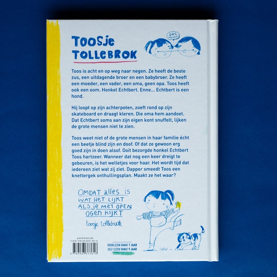 Welkom in de wereld van Toosje Tollebrok. Een meisje van acht met een bijzondere familie en bijzondere bijnamen voor haar gezinsleden. Ik bedoel…als ik vroeger mijn broertje steevast Rotkop had genoemd had ik zelf op mijn kop gekregen, dat weet ik wel zeker. Na een vervelend voorval met haar oom Echtbert, die eigenlijk een hond is, besluit Toos dat er iets moet gebeuren. Lukt het haar om haar familie te laten zien wie oom Echtbert écht is?