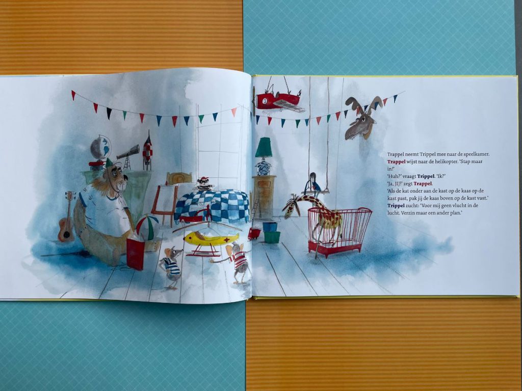 Het boek staat boordevol tongbrekers. De alliteratie in de namen van de hoofdpersonen Trippel & Trappel zorgt natuurlijk al voor een grappige voorleeskwink. Maar doordat er nog veel meer van dit soort dingen in zitten, is het boek een echte tongbreker. En dat is nog best wel even lastig voorlezen. Of tenminste, het voorlezen lukt wel, maar voor mij was het dan toch even lastig om te filteren op de verhaallijn van het boek.