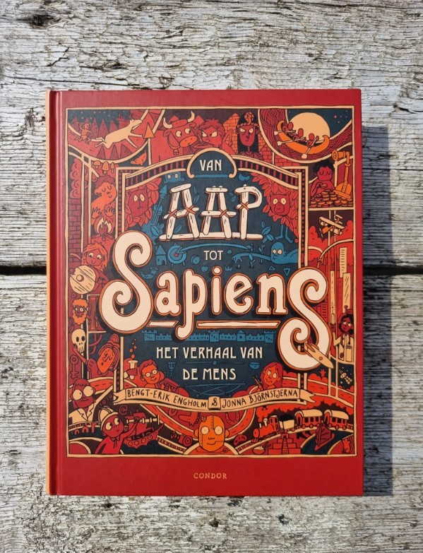 “Hoe zijn wij eigenlijk ontstaan mama” vroeg Jinte, mijn dochter van 7. Oef… dat is nogal een vraag voor het slapengaan. Ze had het mij al vaker gevraagd en ik heb toen wel wat uitgelegd over verschillende ideeën daarover, het christelijk geloof, het afstammen van de apen, hoe de eerste mens leefde, etc. Mijn dochter nam geen genoegen meer met dit ietwat wazige verhaal van mij, dus we hebben Van aap tot sapiens erbij gepakt.