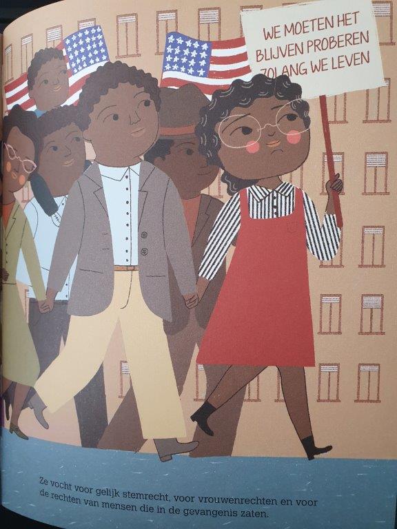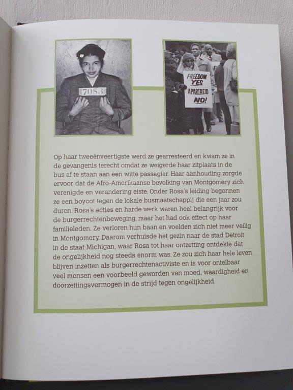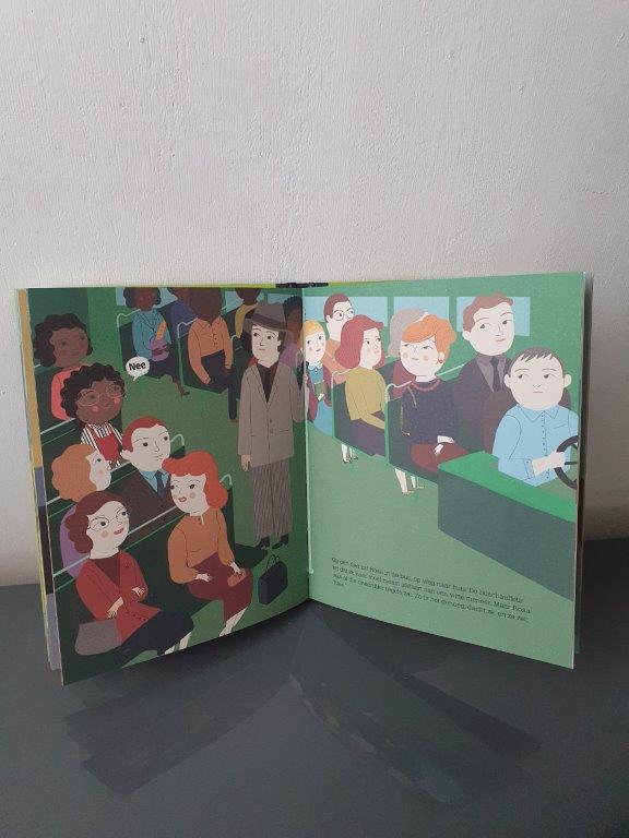 We lezen ook over haar meest grootse wapenfeit: ‘she took a stand by sitting down’. Als een blanke wilde zitten en er nergens anders meer plaats was, moesten Afro-Amerikanen achterin de bus staan. Rosa was het zat, bleef zitten en werd gearresteerd. Het daaropvolgende proces in de rechtbank is legendarisch. Van het zuidelijke Alabama verhuisde ze later naar Detroit om te zien dat het daar niet veel beter was. Haar hele leven werkte ze voor (rechts)gelijkheid voor Afro-Amerikanen op een waardige en moedige manier die bewondering opwekt.