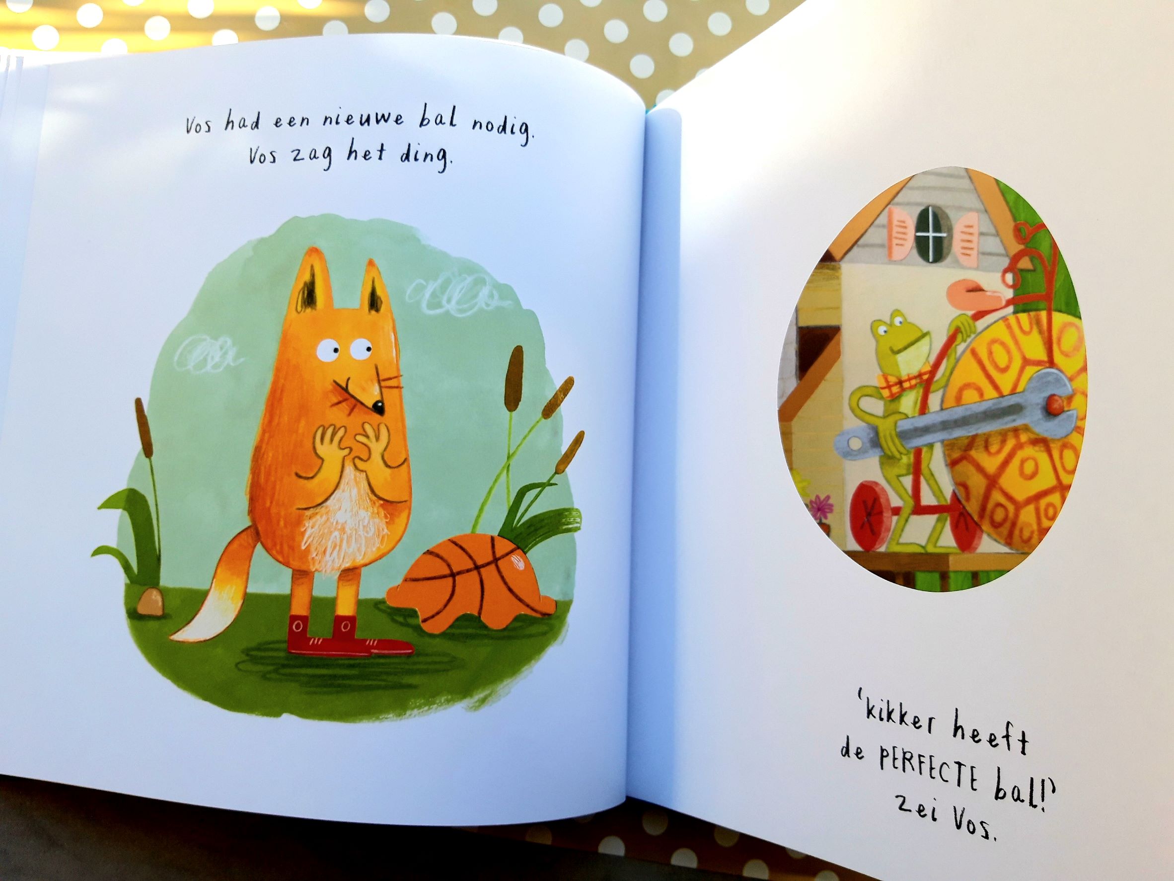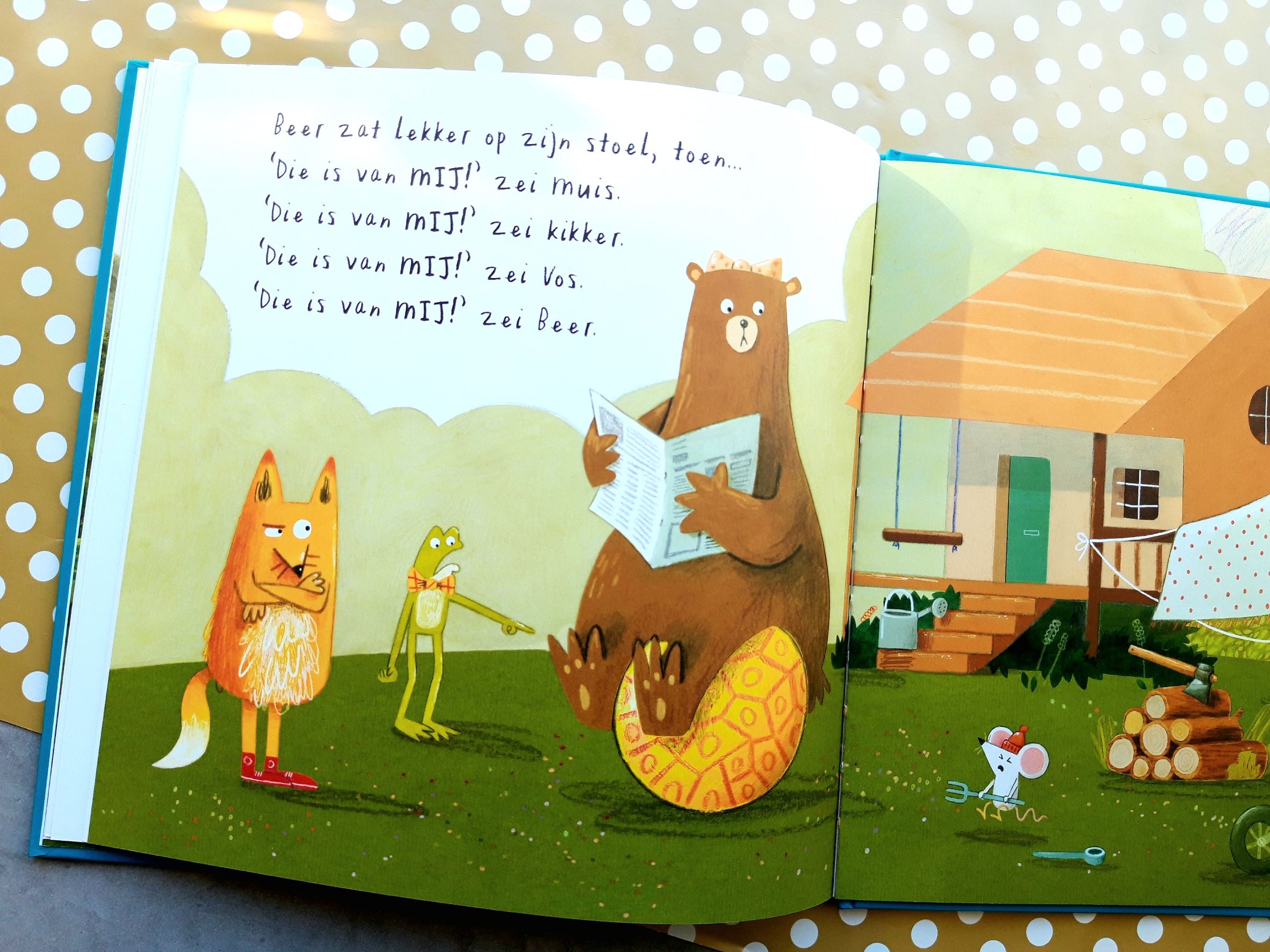 In dit prentenboek Van mij!, van de Britse auteur en illustrator Emma Yarlett lezen we over muis, kikker, vos en beer. Die allemaal een heel goed plan hebben met de grote, gele bal die plots op de heuvel ligt.