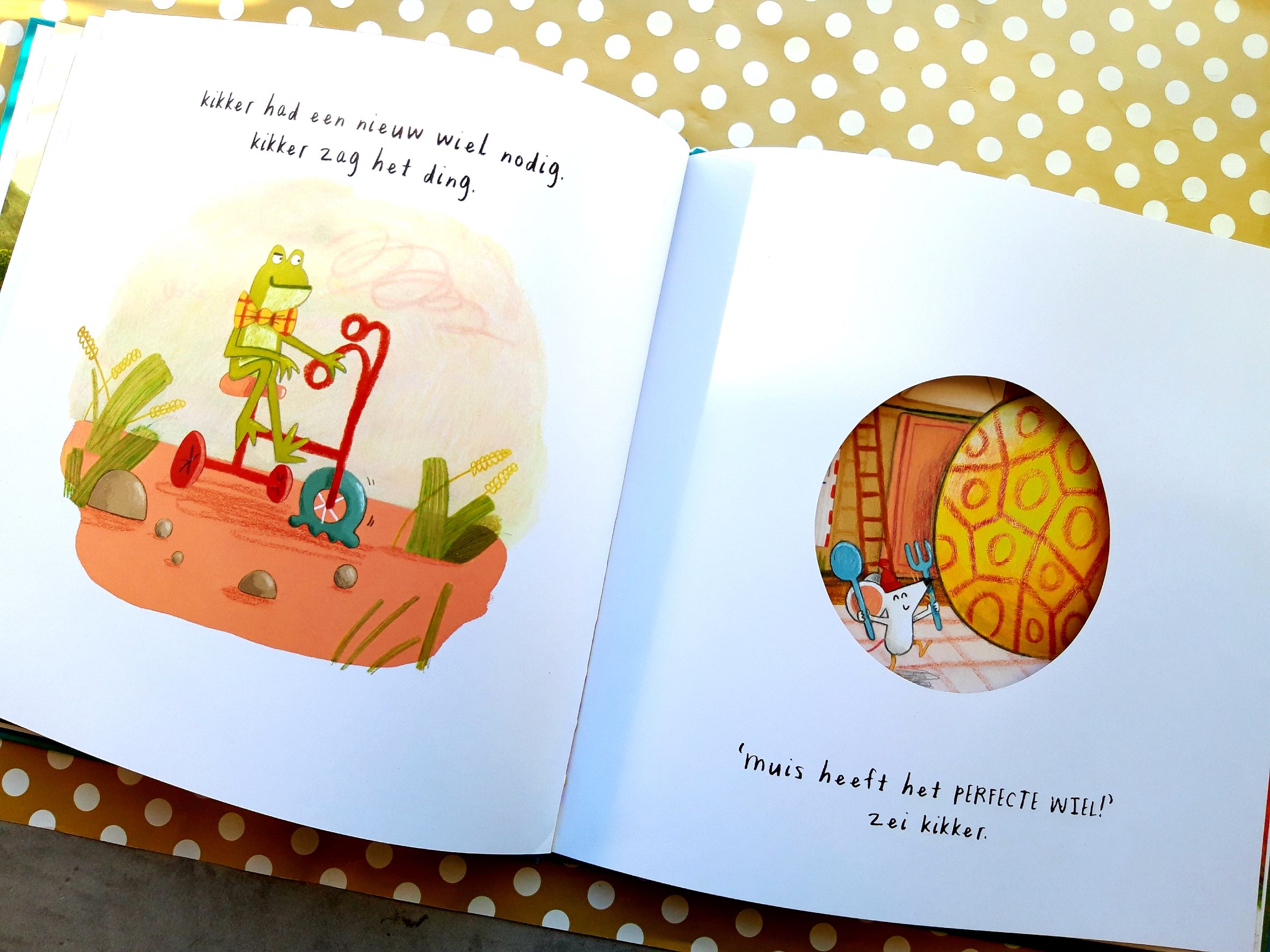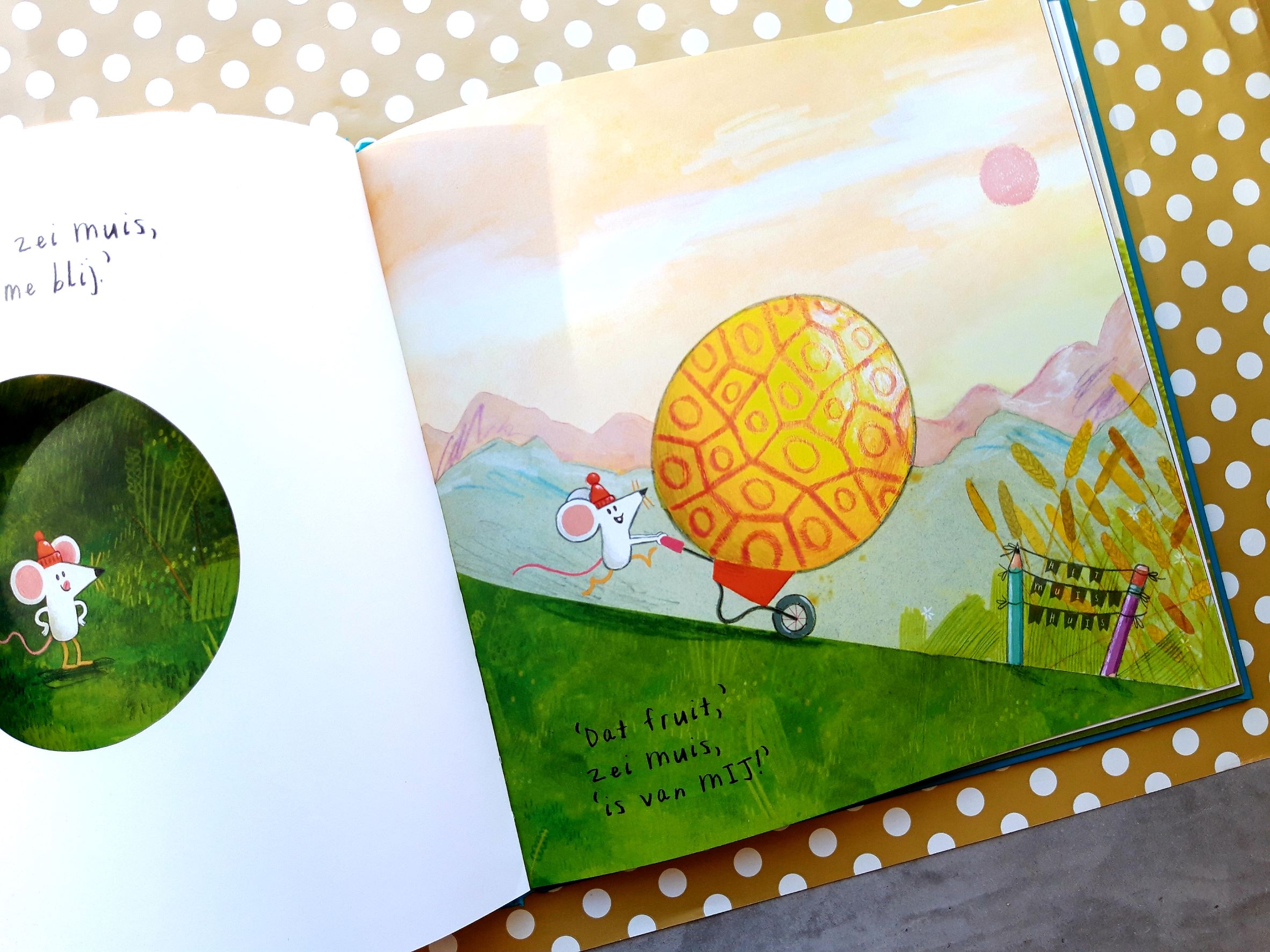 Muis denkt dat het een lekker fruitje is en pikt het als eerste in. Op de kruiwagen gaat het mee naar huis. Maar kikker heeft er andere plannen mee. En hij weet op slinkse wijze de bal te pikken. Alle dieren worden helemaal blij van het vooruitzicht om met deze ronde bal iets leuks te gaan doen. Is het een wiel of misschien wel een stoel? Je kunt er natuurlijk van alles mee verzinnen!