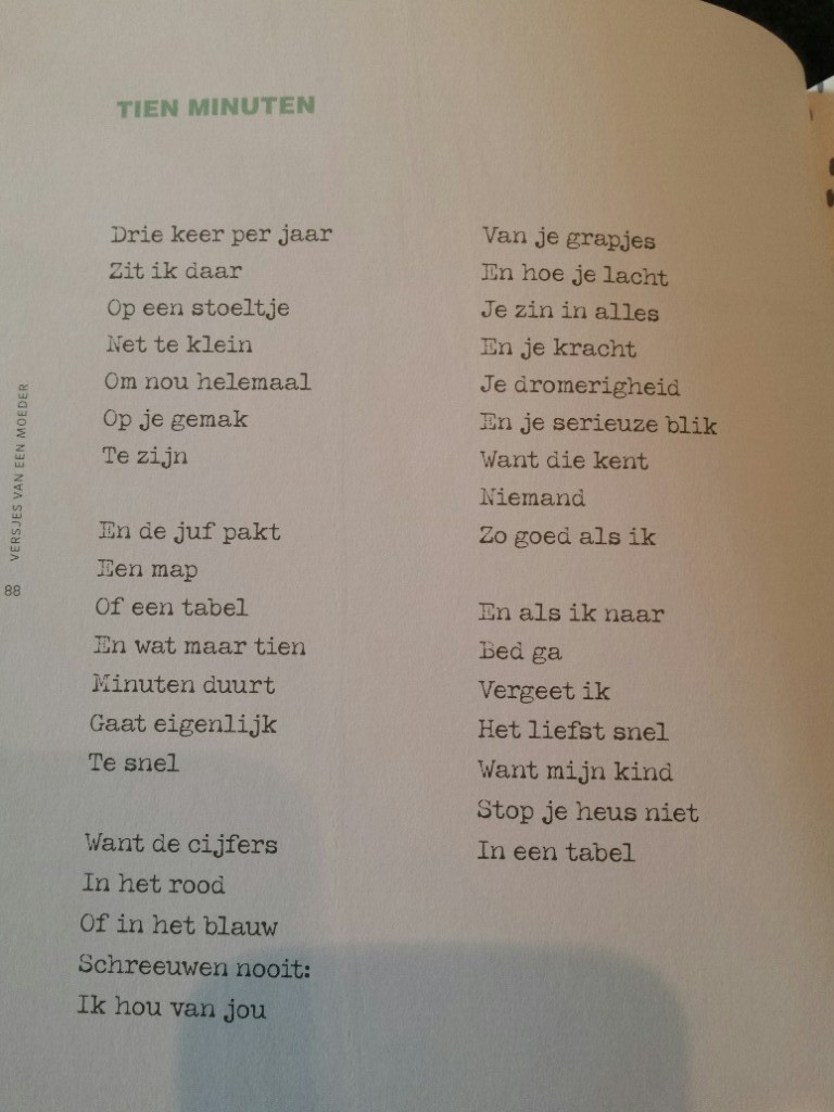 Het derde hoofdstuk uit versjes van een moeder heet: Zorgen Het is erg mooi geschreven over de thermometer die je soms als moeder helemaal niet nodig hebt. In dit hoofdstuk een heel mooi gedicht over een onvervulde mamawens. Toen ik dit las kreeg ik wel een brok in mijn keel.