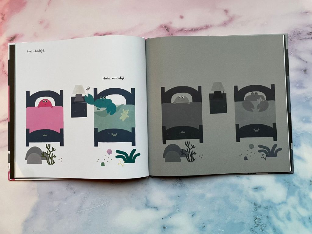 Niet alleen het verhaal is heel grappig, de tekeningen zijn echt GE-WEL-DIG! Ik kan altijd heel erg enthousiast worden van leuke tekeningen, en deze stijl van Marianna Coppo is echt superleuk. Vis en Krab ogen eenvoudig, maar hun mimiek spreekt boekdelen. Door te spelen met hun ogen en bijvoorbeeld een streepje als wenkbrauwen toe te voegen zijn deze 2 diertjes ontzettend grappig. Ook de kleuren in Vis en Krab (en soms juist het gebrek aan kleuren als de lampen weer uit zijn) zijn ontzettend goed gekozen. De toffe tekenstijl van deze illustratrice maakt me nieuwsgierig naar meer van haar boeken, dus ik hoop nog meer van haar te ontdekken!