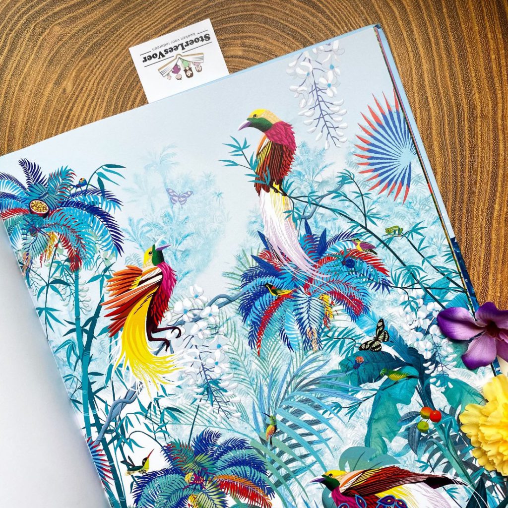 De liefde spat echt uit elke hoek als een kleurrijk (ecologisch:)) confettikanon. Wat een prikkeling, wat een feestje maar echt, wij alleen zijn zo enthousiast over dit boek Vogeleiland. Juist het aspect van Nille, dat ze grafisch vormgever is, is zo’n onwijze toevoeging wat mij betreft. De prenten zitten namelijk grafisch ook zo boeiend in elkaar. Soms natuurlijk, soms juist in een bepaald patroon en soms zitten er bepaalde patronen verstopt. Op sommige prenten is het een blik in de natuurlijke omgeving zoals deze is. En soms komt het dicht bij een Escher compositie. Prachtig dat samenspel tussen grafisch & natuurlijk uitgevoerd in prachtige kleurenpalets.