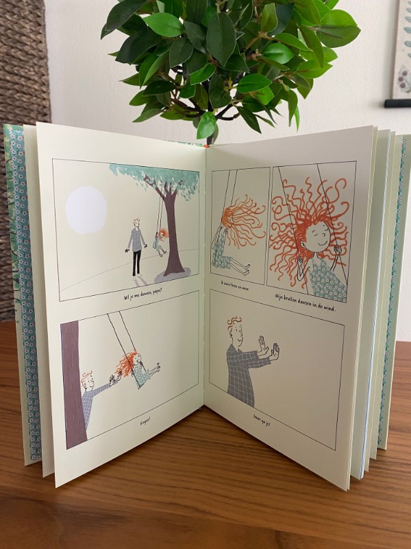 De boom is het middelpunt van fijne momenten in Voor altijd, in alle seizoenen van het jaar en van het leven. Maar dan wordt het winter en het meisje wordt ziek.. Papa moet de boom om hakken om het huis te kunnen verwarmen, een noodzakelijk kwaad. Hij zegt er niks over. Wat een teleurstelling dus als het meisje daar achter komt als ze weer beter is… Maar gelukkig vindt ze in de lente een kastanje. Die plant ze. Er groeit een nieuwe boom en jaren later loopt er een jongen door de tuin. Zijn mama, inmiddels geen meisje meer, hangt een schommel op. Zo kan haar zoontje weer heerlijk zwieren, klimmen en schuilen in de boom.