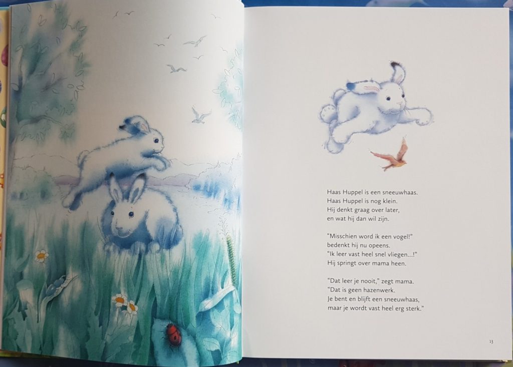 Ik heb alleen nog maar het eerste verhaal gelezen met de kinderen en dat is inderdaad een super mooi paasverhaal. Haas Huppel is een sneeuwhaas en wil graag vliegen. Hij vraagt zich af waarom alle hazen hetzelfde zijn. Maar mama vertelt hem over de paashaas. Niemand heeft hem nog ooit gezien. Hij is sneller dan een storm met windkracht 10, en kan zich heel goed verstoppen. De paashaas is niet bang en vraagt heel beleefd aan de kippen of ze een ei voor hem hebben.
