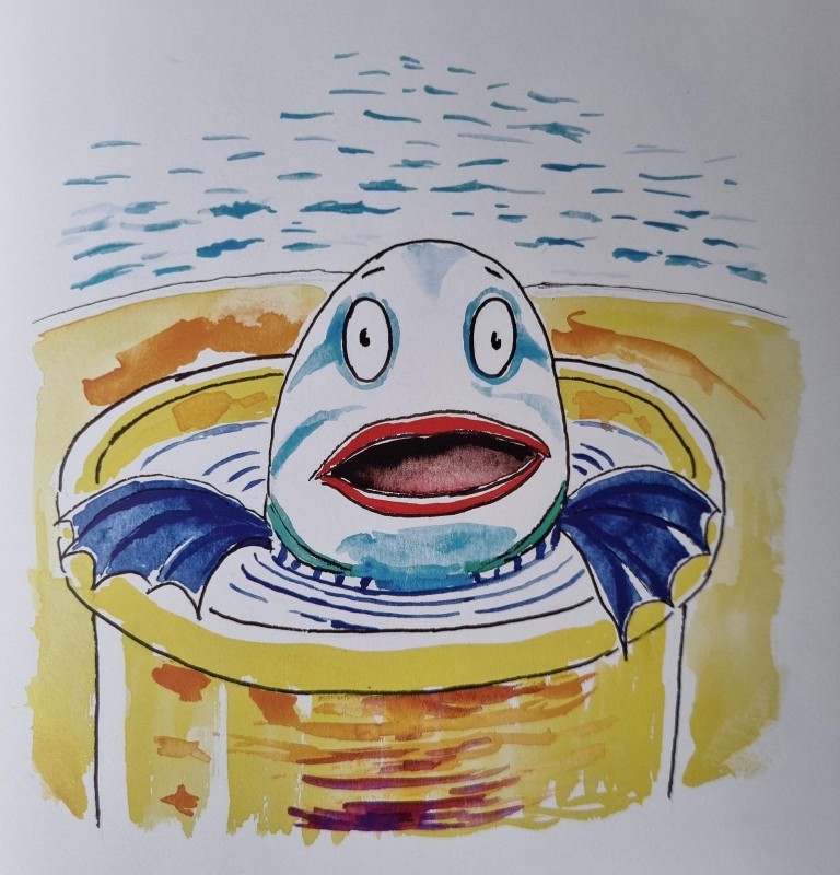 In de basis is het verhaal over Vos en Vis een vermakelijk verhaal. Vos wil een vis vanen en gaat met zijn rubberboot de zee op. Je voelt het al aankomen, hij vangt een vis. Hoe hij dat doet vond ik een hilarische wending, ik zal niet alles verklappen. Eenmaal een vis in zijn emmer gezwiept, weet Vos eigenlijk niet zo heel goed hoe hij nu verder wil. Hij heeft zin om de vis op te eten, maarja… hij moet eerst naar het strand zien te komen.