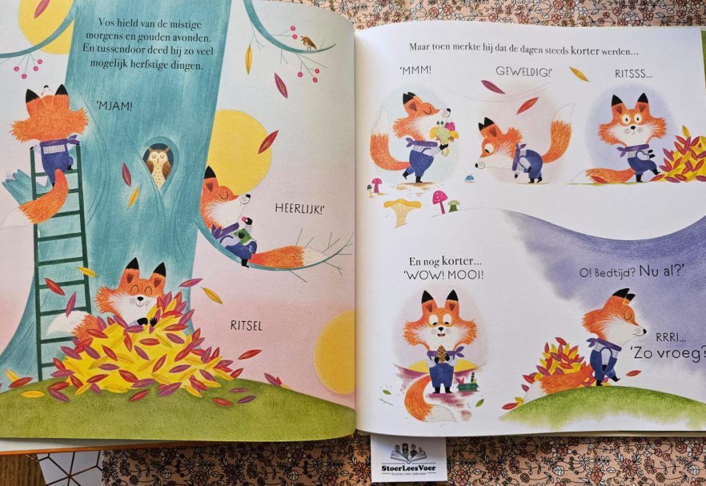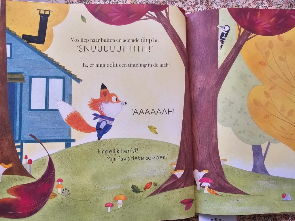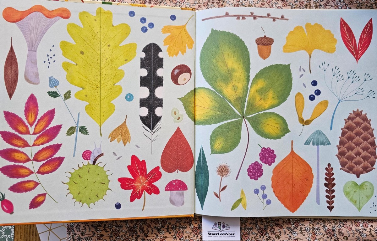 Ik ben weer in een jubel stemming. Aan de binnenkant van het boek zie ik allemaal verschillende soorten bladeren met prachtige goudrode accenten. Een boek die je vast wil pakken en wil openslaan. En als ik dat doe slaak ik weer een kreetje. Wow allemaal verschillende herfstbladeren, herfstvruchten en zelfs een kleine slak. Vos’ favoriete seizoen laat mijn juffenhart een klopje sneller kloppen. Ik ben benieuwd of de rest van het boek dat waar maakt.