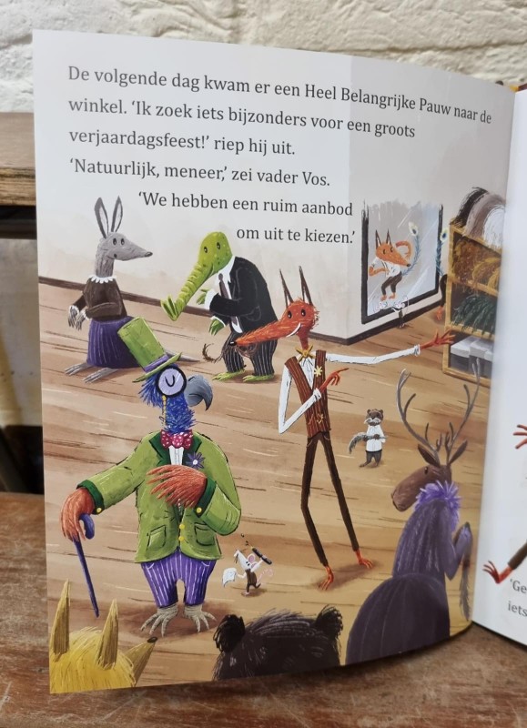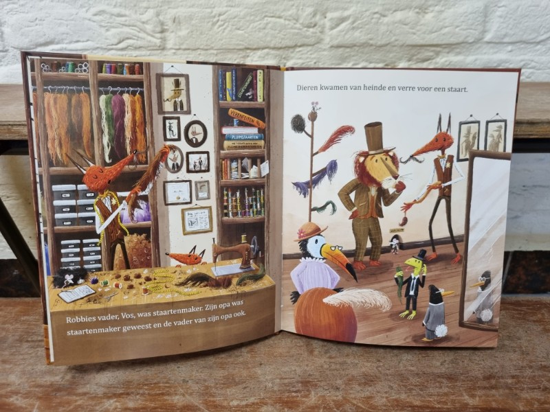 Wauw, wat een plaatje is de cover van Vos & Zoon! Hij komt ook echt op het allerbeste moment door mijn brievenbus. Net nadat mijn collega van de kleutergroep vroeg om een prentenboekentip over de winkel, komt het verhaal over deze staartenwinkel binnen. Precies wat wij zoeken op school. Goed geschreven, rijke taal, genoeg tekst, aanvullende illustraties en genoeg te ontdekken om herhaald te kunnen voorlezen. Ik vertel je graag waarom ik dit boek meteen mee naar school nam!