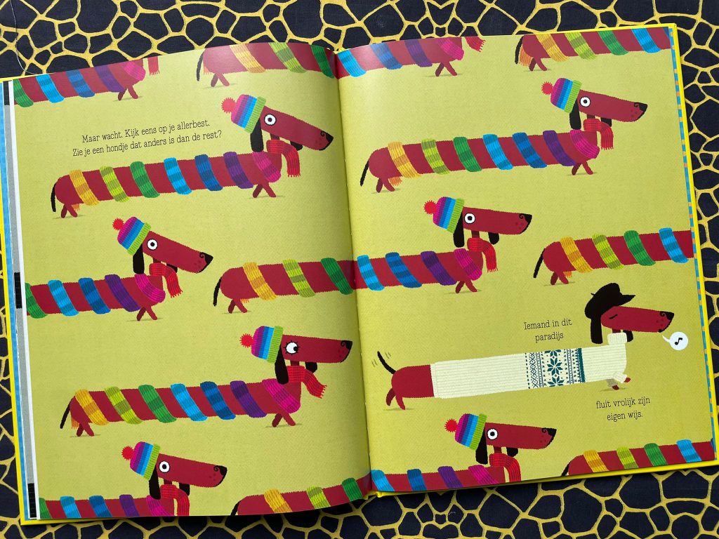 Maar het meest in het oog springend zijn natuurlijk de grappige, vrolijke tekeningen. De eerste bladzijdes ogen een beetje als zoekplaten (zijn al die hondjes echt hetzelfde?), terwijl er in de bladzijdes daarna vooral de focus op de teckel komt te liggen die de vreemde hond in de bijt is. De tekeningen zijn grappig om te zien, en het karakter is aandoenlijk. Voor mij is dit zeker wel een boek wat ik mee zal nemen naar mijn klas, om daar het thema diversiteit onder de aandacht te brengen. Want er is niks mis mee om de vreemde eend… uh hond… in de bijt te zijn!