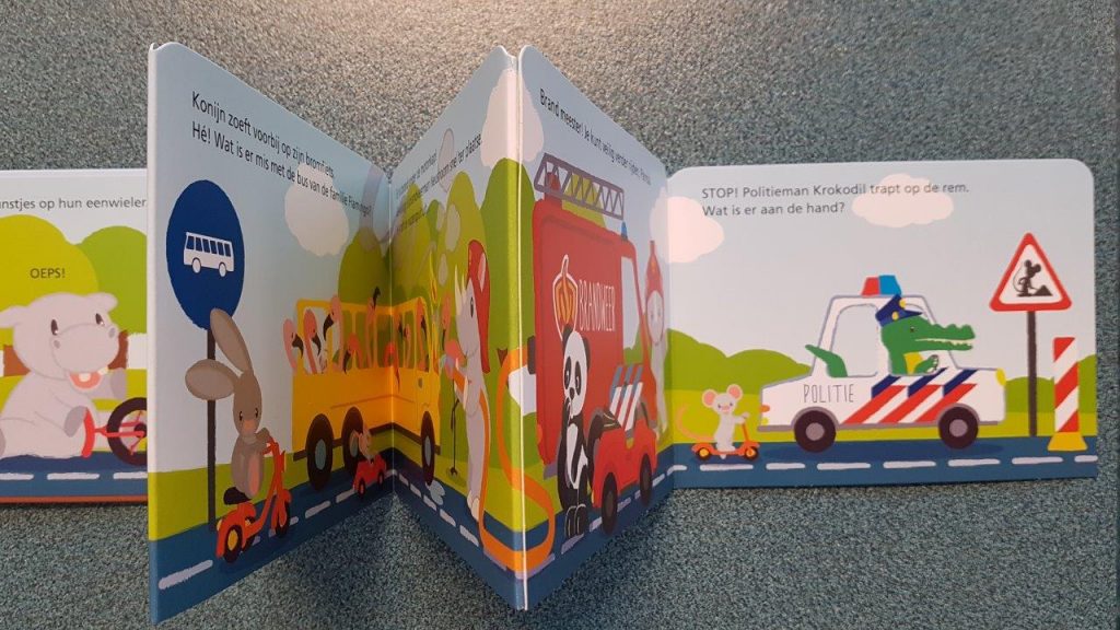 “Panda wil een dagje naar zee,” lees ik hardop. Nadat we een leeuw op een fiets inhalen, verlengen we de route ruim door de lááánge opgevouwen bladzijde neer te leggen. Muizen op eenwielers, de bus van de familie Flamingo en allerlei hulpdiensten die ingeschakeld moeten worden. Ik zag spontaan allemaal beren op de weg. Wat een avontuur! “Zit je gordel goed vast?” vraag ik aan mijn zoontje die de geluiden van de sirenes nadoet.