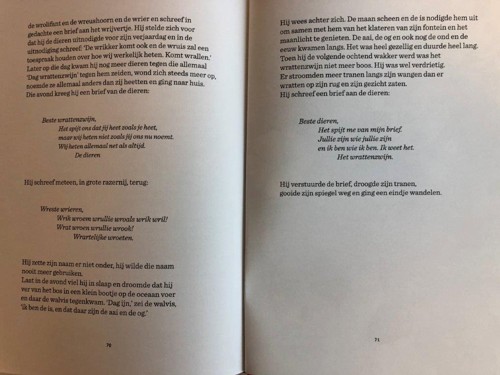 Toon Tellegen was bij mij al bekend toen ik zijn nieuwe boek, De vuurzeevlieg en andere dierenverhalen, las. Voor de kinderen ooit ‘wat dansen we heerlijk’ gekocht en veelvuldig gelezen. Mijn eerste boek dat ik zelf kreeg was ‘wordt er dan echt niemand boos’. De persoon die mij dat boek gaf wilde mij wat vertellen.