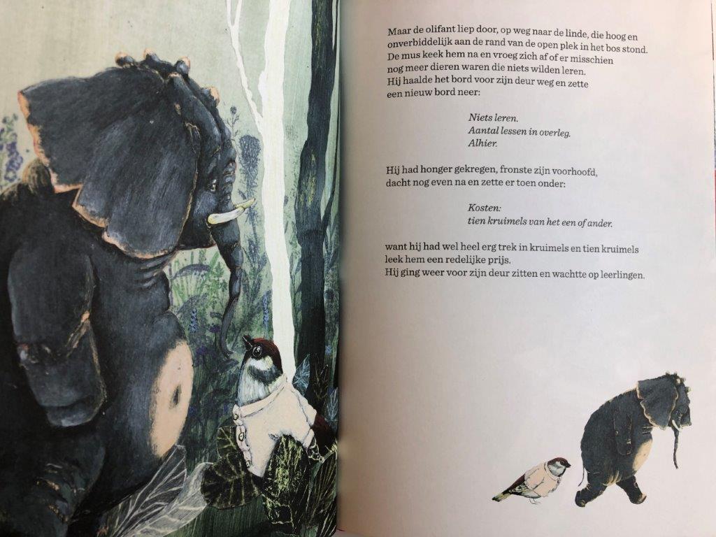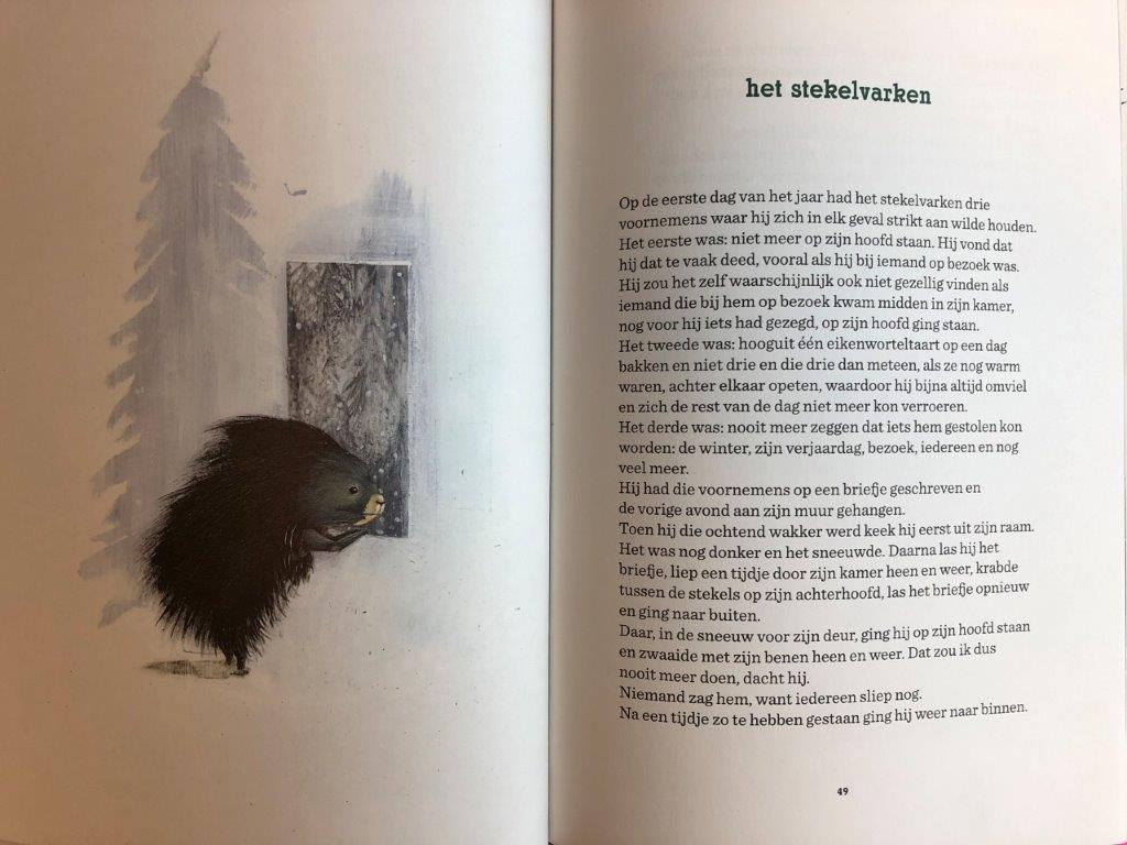 Verschillende verhaaltjes zijn heerlijk om te lezen. Het verhaal van de mus bijvoorbeeld die les geeft in alles, maar geen klanten krijgt. Vervolgens zet hij een bord neer: Niets leren, aantal lessen in overleg, alhier. En hij wacht op leerlingen. Geweldig toch? Vanwege het nieuwe jaar, het verhaal van het stekelvarken . Het gaat over goede voornemens. Beter dan in dit korte verhaal kan ik niet laten zien hoe geweldig de dierenverhalen van Toon Tellegen zijn. Uit de vuurzeevlieg en andere dierenverhalen, het stekelvarken.