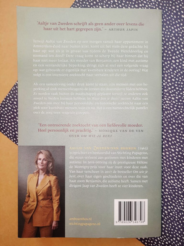 In ‘Waar ben je thuis’ volg je van Zweden’s eigen zoektocht naar goede zorg en een fijn huis voor haar zoon Benjamin. Door een eigen plek te creëren, het Papageno huis is zij extra betrokken hierin. Maar het boek gaat niet alleen over haar eigen kind, in de samenleving zoals we die nu kennen. Ogenschijnlijk toevallig komt er een gedachte bij haar op: wat was de plek van deze kinderen met een beperking in de Tweede Wereldoorlog? Wie keek er toen naar hen om, wat is er met hen gebeurd? In het rijk van Hitler was er waarschijnlijk weinig ruimte voor iemand met een beperking. Van Zweden gaat op onderzoek uit en stuit op persoonlijke en vaak ook vreselijk indringende verhalen.