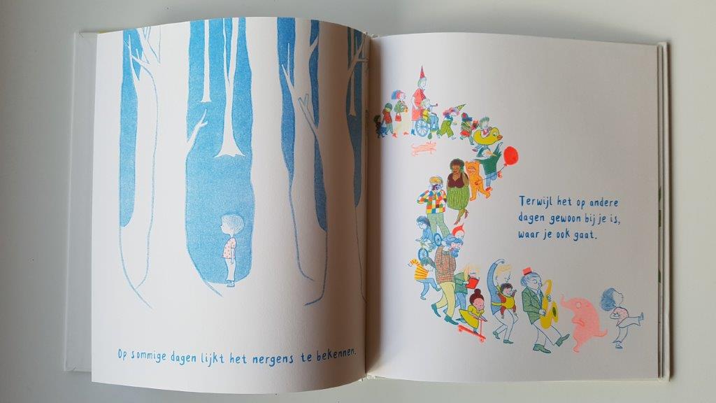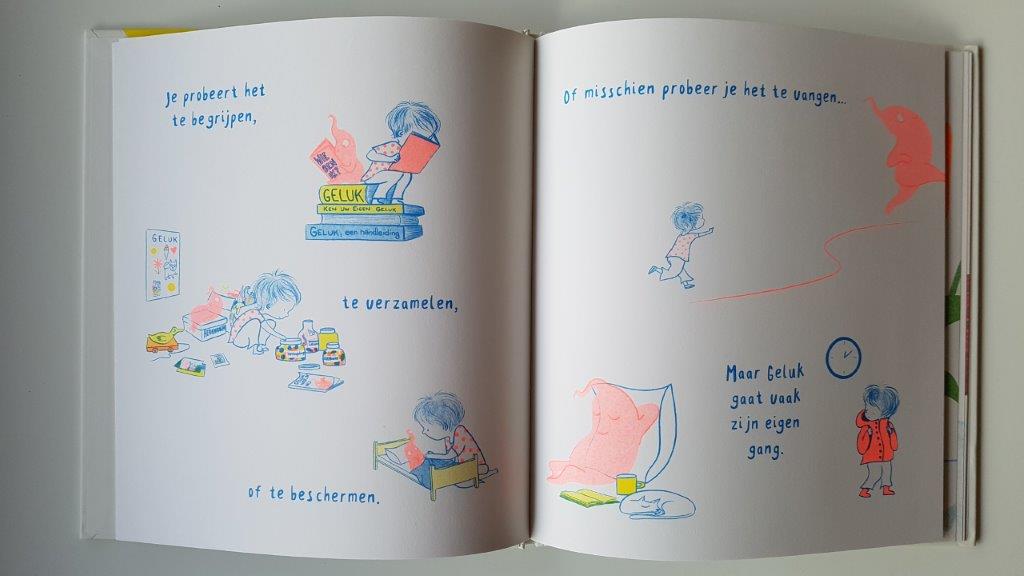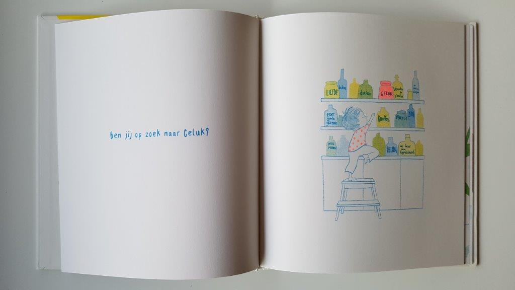 We hebben allemaal geluk nodig in het leven. Maar soms is het moeilijk bereikbaar zijn en voelt het heel erg weg. In eenvoudige tekeningen van ‘Waar geluk begint’, zie je een kindje zoeken naar Geluk. Als eerste zoekt hij via een opstapje tussen allerlei potjes en flesjes op een hoge plank. Vervolgens zie je Geluk in beeld als een soort lief en meegaand ‘spookje‘.