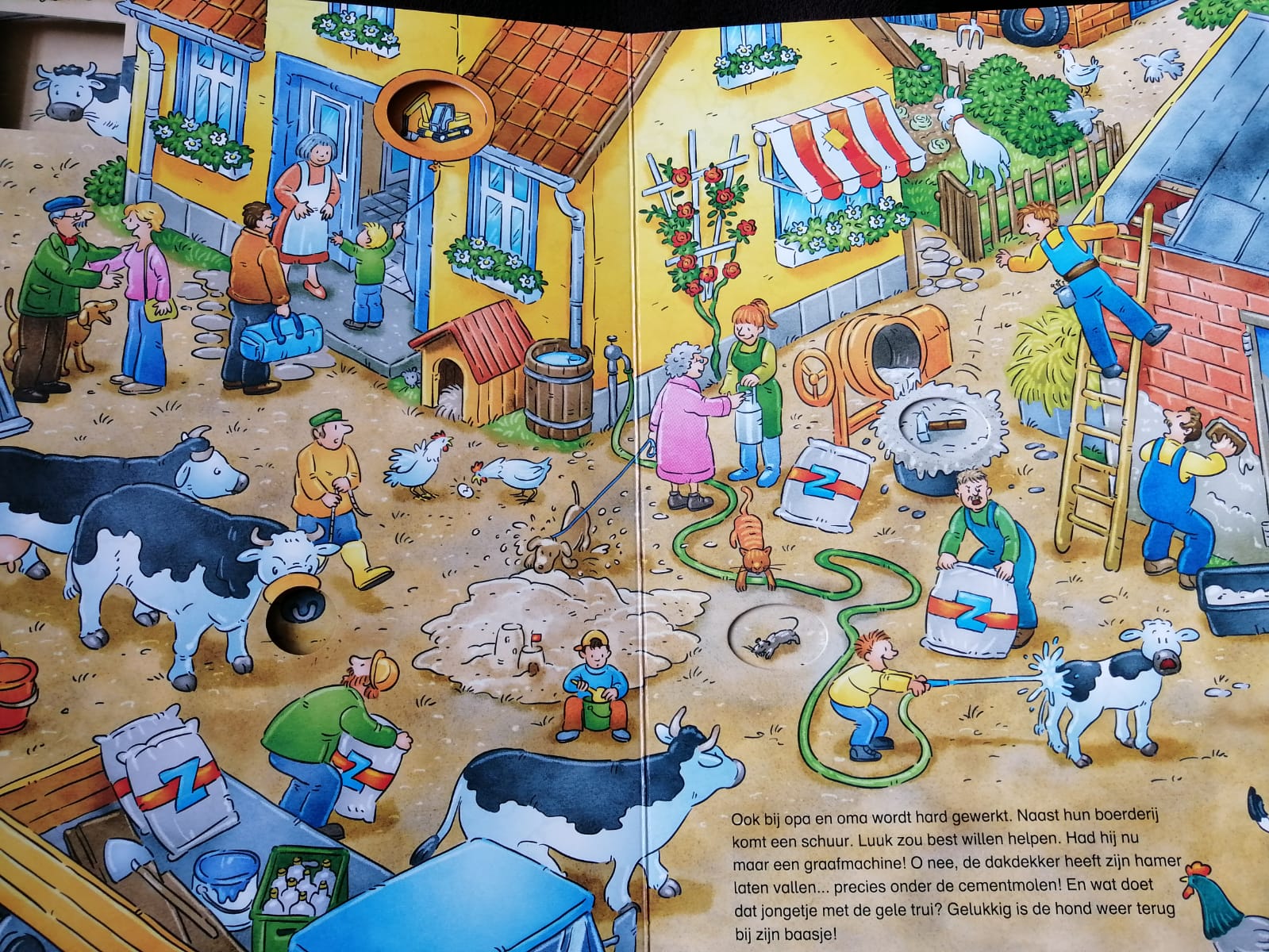 Alleen maar lof voor dit super leuke boek. Het formaat is perfect. Mijn dochter kruipt snel op de bank en gaat op onderzoek uit met dit prachtige boek in haar handen. Ze kan er zelfs achter verdwijnen! Doordat de illustraties zo uitgebreid zijn en het om voorwerpen en situaties gaat die peuters en kleuters zullen herkennen, zien kinderen hier ontelbaar veel leuke dingen. Een feest van herkenning dus! Zodra de gele graafmachine is gevonden, dwalen onze ogen af en zien we nog zoveel meer. Zoals een klimrek, muizen, een ladder, vogels, koeien, een slapende poes. En zo kunnen we nog wel even doorgaan.