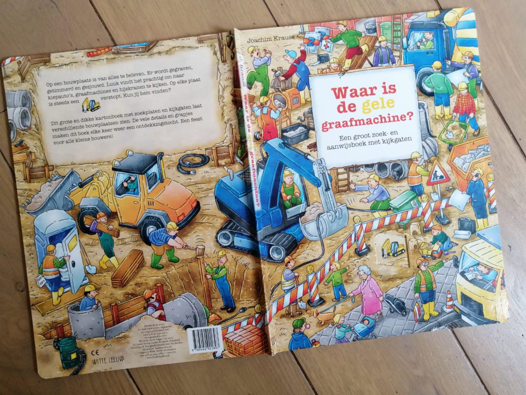 Zoek en gij zult vinden! Dit boek is echt het einde voor kinderen die houden van het zoekelement in boeken en gek zijn op allerlei machines. Ik heb zo’n dame in huis met een hele duidelijke interesse voor vrachtwagens, bussen en natuurlijk graafmachines. Jullie snappen dat dit boek niet in onze boekenverzameling mag ontbreken. Kijken jullie mee naar Waar is de gele graafmachine?