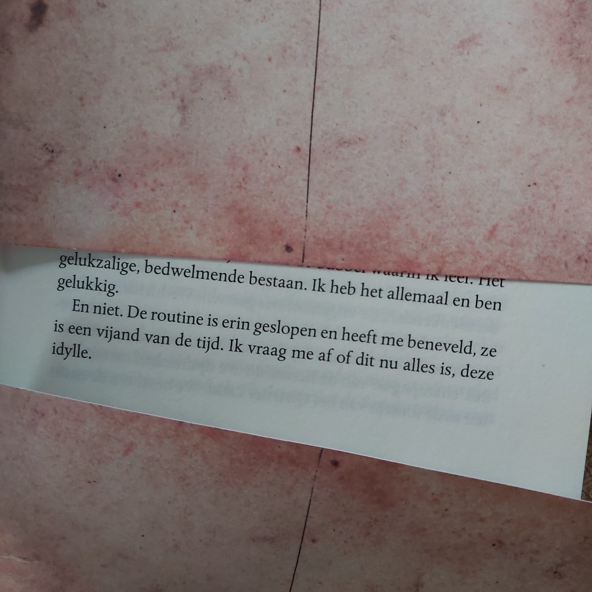 ‘’Ik heb het allemaal en ben gelukkig. En niet. De routine is erin geslopen en heeft me beneveld, ze is de vijand van de tijd. Ik vraag me af of dit nu alles is, deze idylle.’’