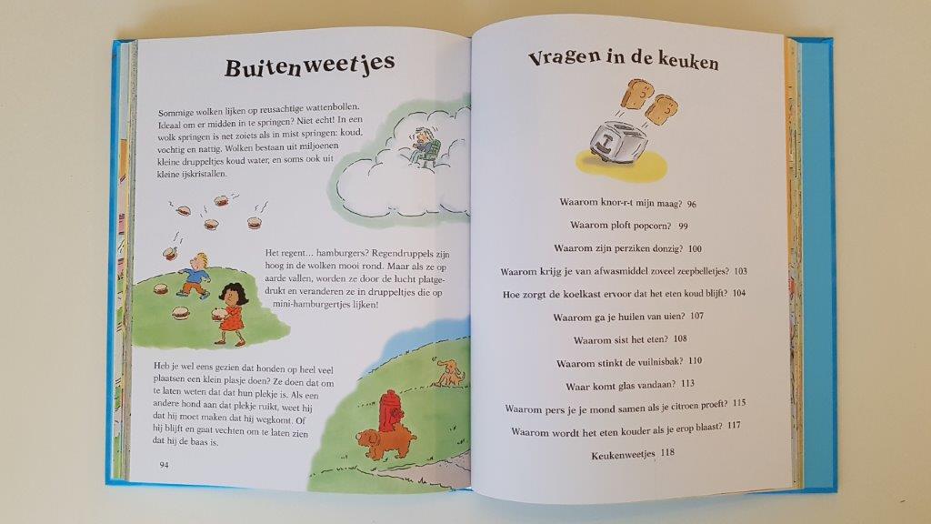 Eigenlijk bij alle activiteiten stelt mijn zoontje duizend-en-één vragen. Tijdens een wandeling in het park ziet hij vliegtuigstrepen in de lucht. “Waarom is dat?” En hij heeft een periode gehad dat hij de wc niet door wilde trekken, omdat hij niet wist waar het water heen ging. En wanneer hij mij helpt in de keuken, vraagt hij ook heel veel. In dit eerste vraag- en antwoordboek worden veel mysteries ontrafeld op een duidelijke en eenvoudige manier.