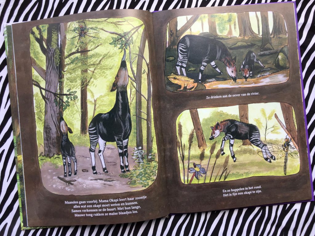 De tekeningen in Wapi zijn echt authentiek en waarheidsgetrouw. Deze zijn gemaakt door de Congolese illustrator Patrick Ntabaza. Verfrissend om te zien dat deze illustraties niet speciaal ‘menselijker of liever’ gemaakt zijn dan de werkelijkheid. Dus geen cartoonachtige okapi, met grote ogen, maar een okapi zoals deze er ook in het echt uitziet. En toch is er zat gevoel en emotie in de tekeningen gelegd, door de houdingen van de dieren.