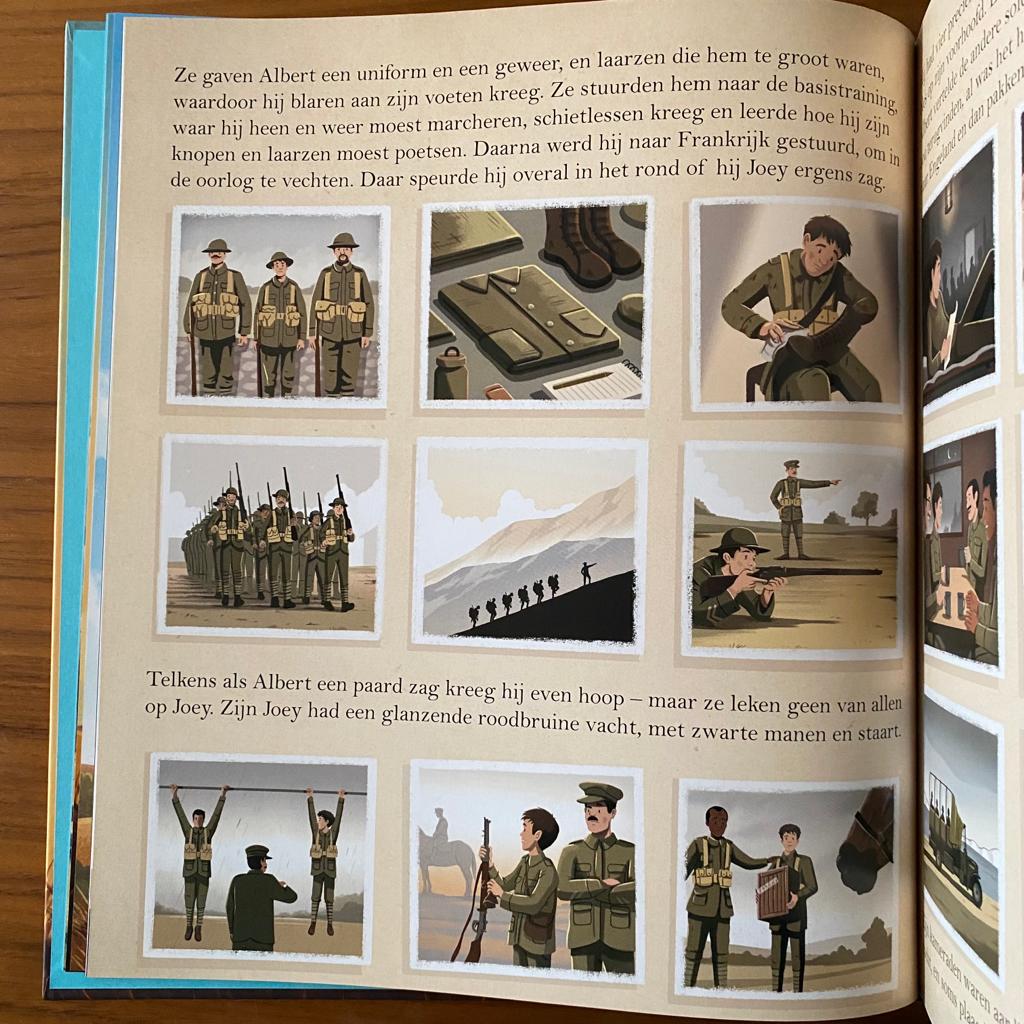 War horse begint in Engeland met de sterke vriendschap tussen een paard en een jongen. Maar aan die vrede komt een eind. Als op een dag Alberts paard Joey naar het leger moet, gaat Albert trouw zijn paard achterna. Zo jong als hij is, wordt hij toch soldaat in de eerste wereldoorlog. Albert is er rotsvast van overtuigd dat hij Joey terug zal vinden. Dat merk je in dit prentenboek voor kinderen van acht jaar en ouder. Maar gaat het hem lukken?