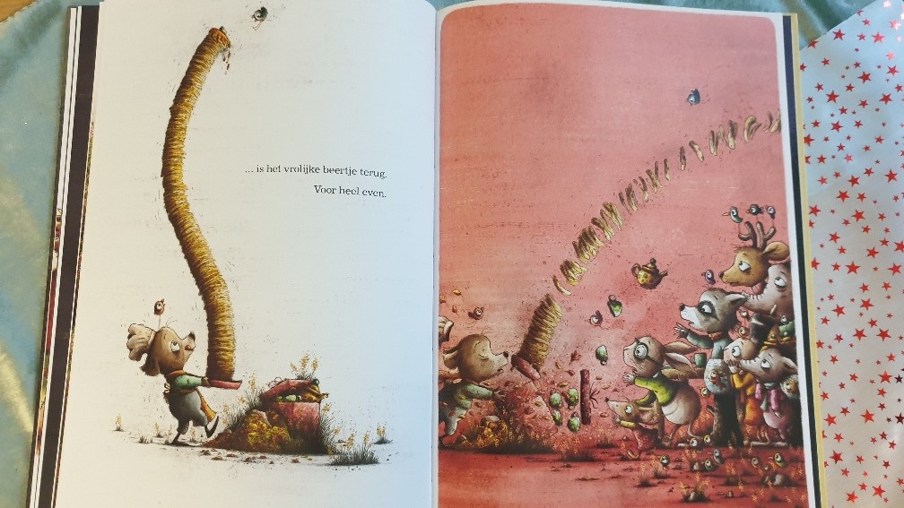 Wat een prachtige prenten in warme melk met honing. Veel oranje rood en groen teinten, leuk fantasievol getekend maar toch ook heel erg echt lijkend. Zo zie je een schaakbord inclusief een klok en prachtige andere dingen. Ga maar zoeken. De pagina’s zijn vrij donker, maar dat past perfect in deze tijd voor het jaar. Prachtige bomen die van groen naar volop in bloei naar de prachtige herfstteinten veranderen.