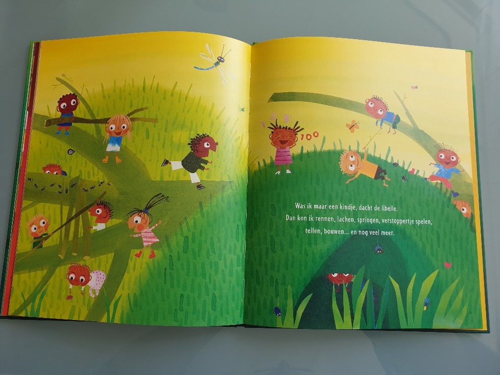 De vlinder wil graag een wandelende tak zijn, die wil graag een schrijvertje zijn en zo gaan we door met het verhaal tot we uitkomen bij een Libelle. De libelle wil graag een kindje zijn!