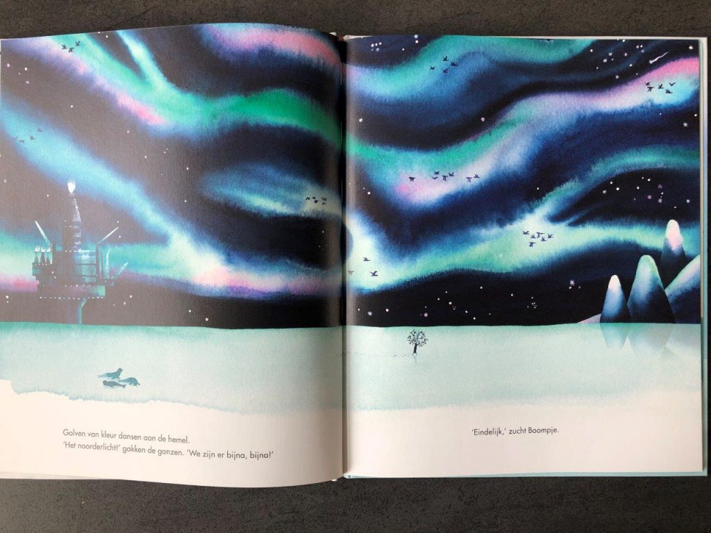 Dan weet Boompje het: ‘Ik moet het de bomen vertellen!’ Bij thuiskomst vraagt Boompje aan de bomen of zij weten waardoor het komt dat het ijs smelt. Daar eindigt het boek. We krijgen als lezer geen antwoord. Tegelijkertijd weten we dat alle verandering begint met het stellen van een simpele vraag die vaak door kinderen wordt gesteld: waarom…? De illustraties van Wat ik de bomen wil vertellen zijn magisch realistisch. Je krijgt het gevoel alsof je er zelf bij bent. Alsof je zelf het Noorderlicht kan zien en je de kou voelt. Al die prachtige dieren die daar leven. Het zet het verhaal extra kracht bij.