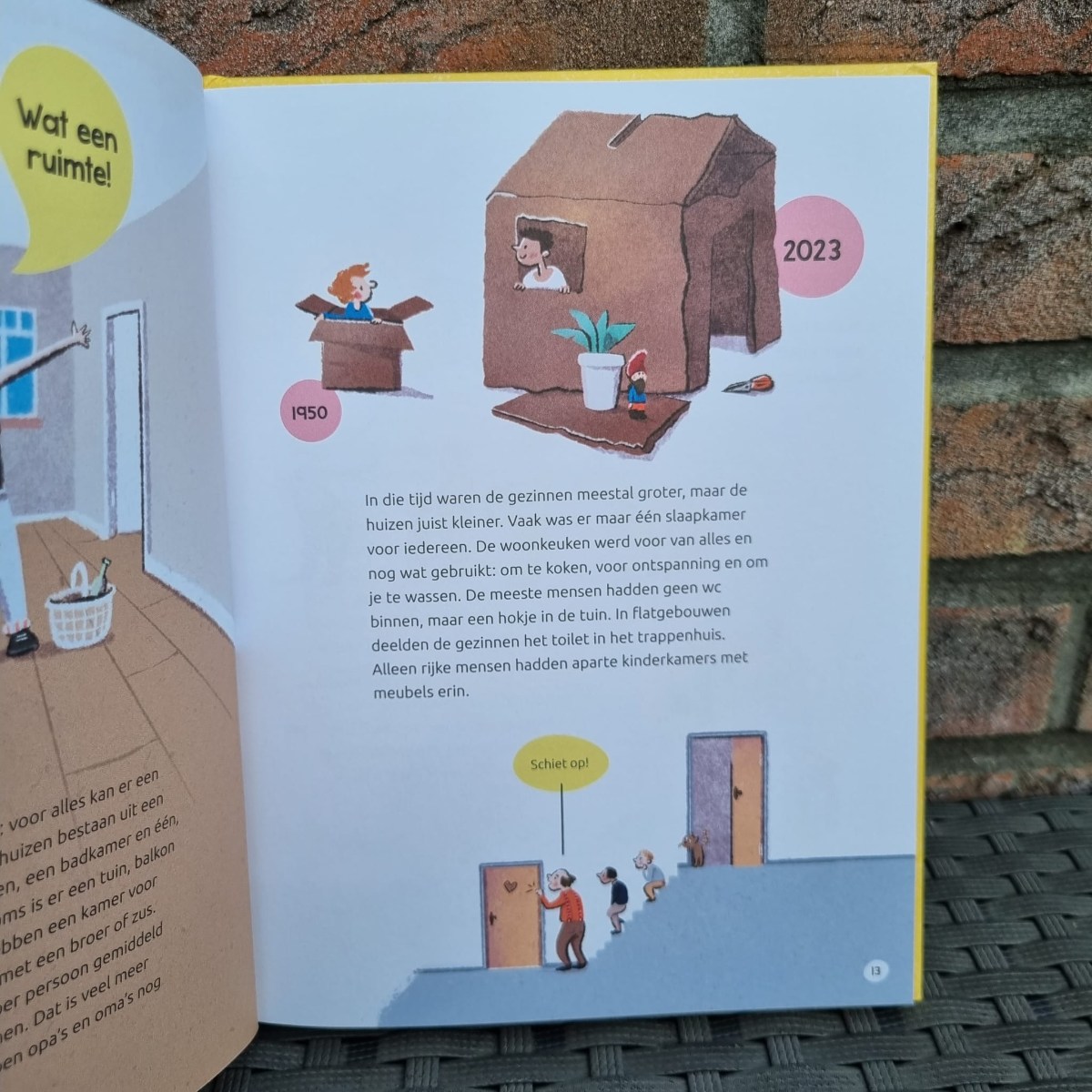 Zoals gezegd vind ik de ondertitel van Wat is thuis? goed gekozen. In de eerste plaats gaat het over wonen. Over dat we steeds groter zijn gaan wonen, dit wordt ook mooi geïllustreerd. Maar ook over huur- en koophuizen, het duurder worden van huizen, het bouwen van woningen, verduurzamen. Dit wordt ondersteund met goede infographics en andere illustraties.