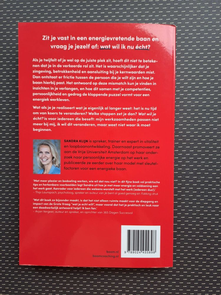 Wat wil je echt? is een overzichtelijk en handig boek om te onderzoeken hoe je naar je eigen baan kijkt. Als je twijfels hebt bij je werk, kan dat aan verschillende aspecten liggen. Soms betekent dat dat je op zoek moet naar een andere baan en soms is het iets wat je kunt aanpassen in je huidige werk. Auteur Sandra Klijn is gepromoveerd op het onderwerp persoonlijke energie op het werk. En daarmee dus ook expert op dit thema. Voor mijzelf een belangrijk onderwerp: in werk gaat (vaak) veel tijd zitten, dus dan is het ook belangrijk dat je je er prettig voelt. In Wat wil je echt? duiken we de verschillende onderdelen in die een baan maken of breken. Dat is een individuele inschatting, dus het is echt een boek om je aan het denken te zitten over je eigen situatie.