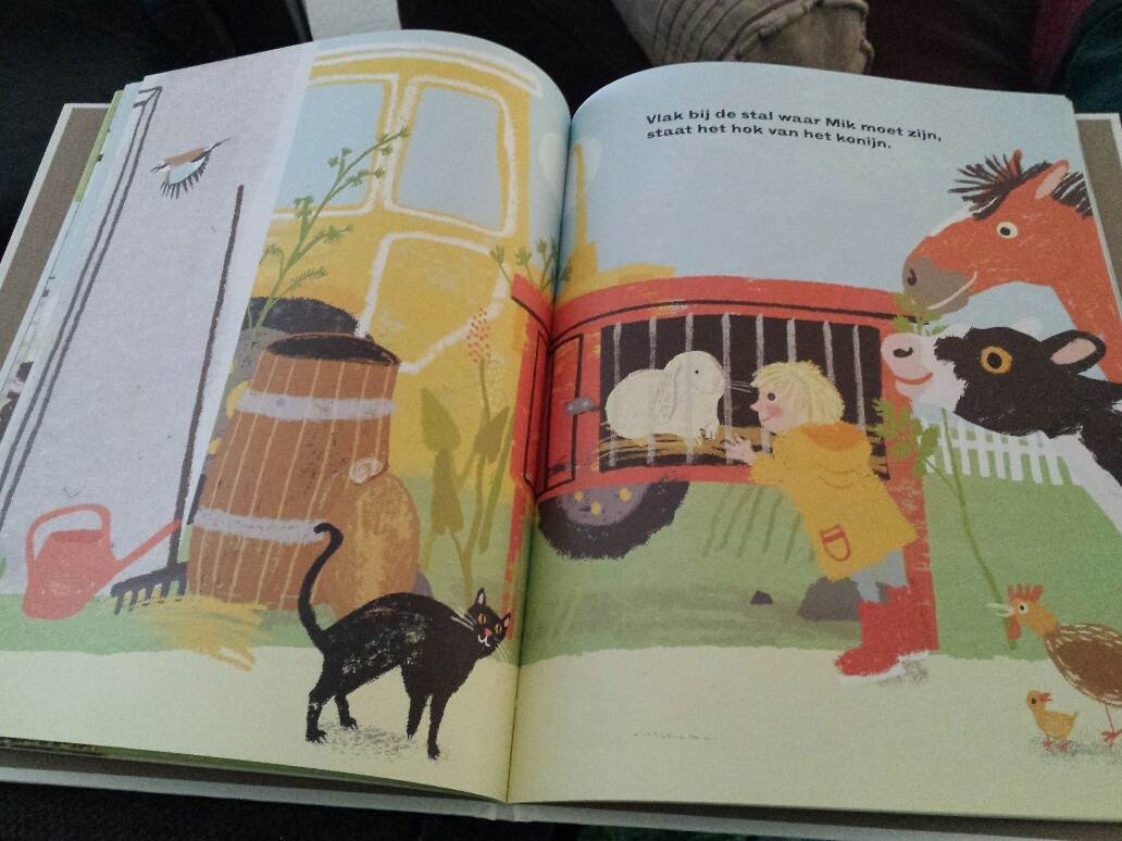 Het prentenboek, uitgegeven door Gottmer, bevat prachtige illustraties en zowel de kaft als de pagina’s zijn op matpapier gedrukt. Op elke pagina kun je meerdere dieren bewonderen terwijl Mik langs de koe, paard, kip, konijn, en het varken met haar big komt om naar het nieuwe geitje te komen. De boer neemt Mik en de dieren mee naar de stal waar het nieuwe geitje ligt te slapen.