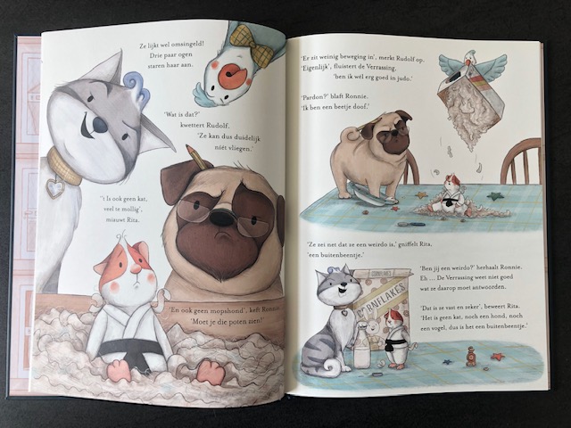 Dit soort boeken bevat altijd een wijze les. Zo ook in Weirdo. Uiteindelijk belandt Ruby een paar deuren verderop bij een oudere, zonderlinge mevrouw. Daar leert zij dat ze helemaal prima is zoals ze is. Ze hoeft niet op andere dieren te lijken of in een format te passen. En ze is niet de enige die niet in een bepaald schema past. Dat is ook wel fijn om te weten. Daarop keert Ruby terug bij Rosa. Kan ze alsnog het verjaardagscadeau voor Rosa zijn. En leren de overige huisdieren dat hun vooroordelen onterecht zijn. Of zit ik nu teveel te spoileren? Anyway, een goede aanwinst voor de boeken in de kast van leerkrachten met als thema vooroordelen. Anders gezegd: Wees lekker jezelf en trek je niets aan van wat anderen van je denken.