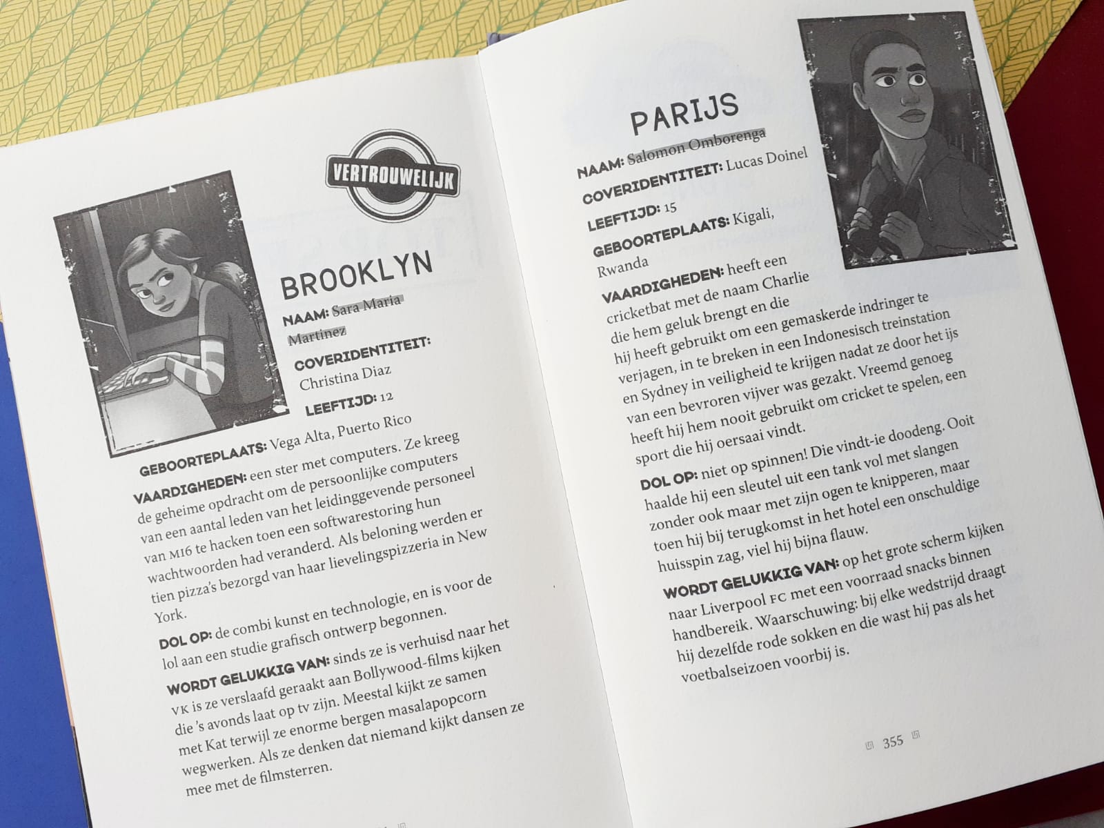 Maar uiteindelijk blijkt natuurlijk dat je juist als groep sterker bent, omdat je elkaar aanvult. De precieze achtergrond van deze stoere kinderen zal in het eerste deel meer aan bod komen. Dus dat is wel de tip om deel 1 als eerste te lezen. Want dit boek maakt wel nieuwsgierig naar het verhaal van deze dappere kinderen. Gelukkig staat er achter in het boek een kort spionnenpaspoort met alle vertrouwelijke informatie!