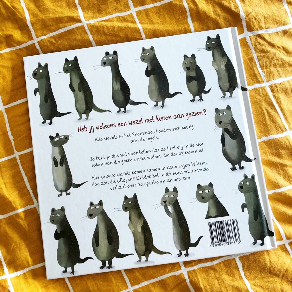 Heb jij wel eens een wezel met kleren aangezien? In het Snorrenbos woont een groep wezels en die groep wezels houden zich keurig aan de regels. Je snapt wel dat die keurige groep wezels helemaal in de war raken van die ene gekke wezel die gek is op kleren. Die ene Wezel Willem die durft anders te zijn. De groep komt samen in actie tegen Willem want het moet toch niet kunnen anders zijn en tegen de regels in gaan? Hoe dit afloopt ontdek je in het hartverwarmende verhaal over acceptatie en anders zijn.