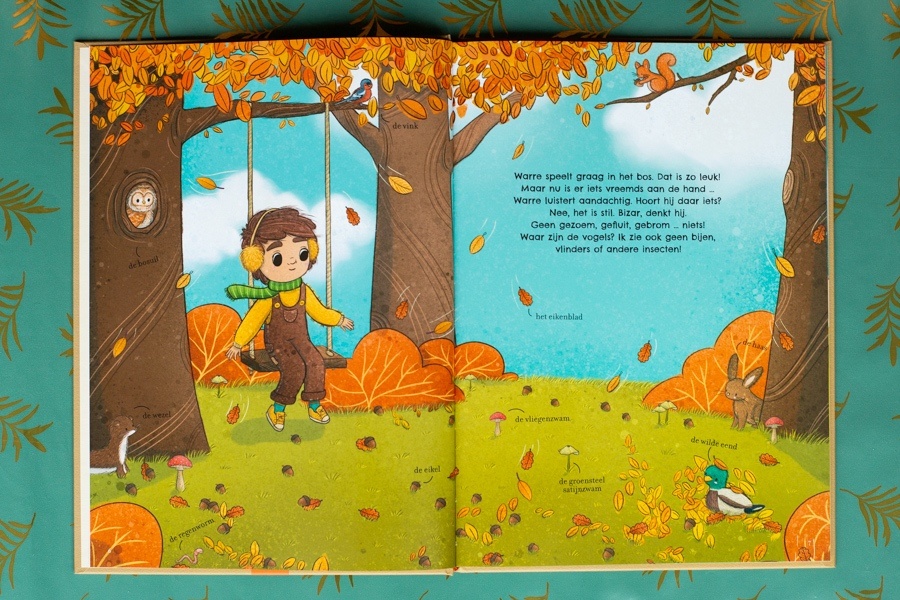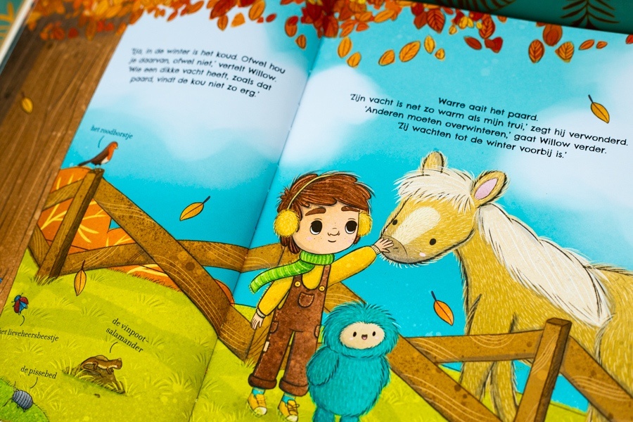 De illustraties van Willow en Warre zijn ook erg mooi. De kleurrijke Willow valt op in de natuur. En de vrolijke, nieuwsgierige Warre leert van alles bij door met zijn vriendje door de natuur te wandelen. Samen op ontdekkingstocht net als Willow en Warre, daar heb ik na het lezen van dit ecologisch prentenboek gedrukt op FSC papier, ook wel zin in. Vergrootglas mee en zoeken maar.