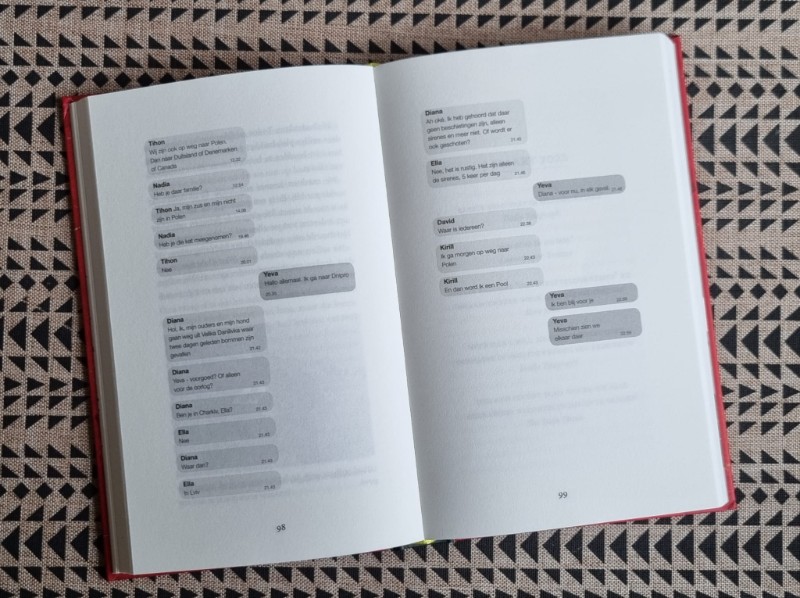Elk hoofdstuk beslaat een dag net voor de oorlog of er in. In een paar steekwoorden wordt weergegeven wat er die dag gaat gebeuren. Er staan tijdsaanduidingen bij, zodat je echt meegaat in de dag met Yeva. In totaal lopen we 67 dagen mee met Yeva en afsluitend staan er ook verhalen van haar vrienden in. Tekst wordt afgewisseld met whatsappgesprekken en foto’s. De foto’s maken het nog beeldender en het is, met name voor jongeren, heel goed om een beeld te krijgen bij wat er zich afspeelt in Oekraïne.