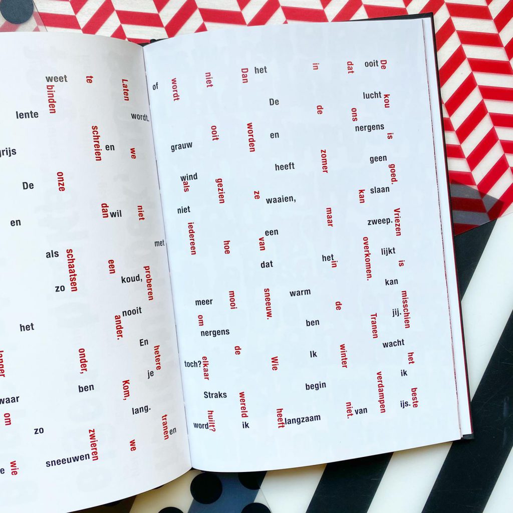 Een strijd ontstaat, een visueel typografisch genot. Hoe ‘Ze gaan er met je neus vandoor’ precies afloopt, verklap ik niet. Maar dat er enige verwonding plaatsvindt en dat er een aantal letters gehavend uit de strijd komen is zeker. Geen oorlog zonder schade. Geen oorlog zonder lessen. En dat geldt ook voor liefdesverdriet, geen liefde zonder verdriet. Waar mensen zijn zullen emoties zijn. Er zullen andere gedachten zijn die niet voor iedereen hetzelfde zijn. Gelukkig is er altijd ruimte voor opbouw. En hopelijk leren we ooit eens als mensen dat oorlog voor misschien wel het grootste onnodige verdriet in onze wereld zorgt.