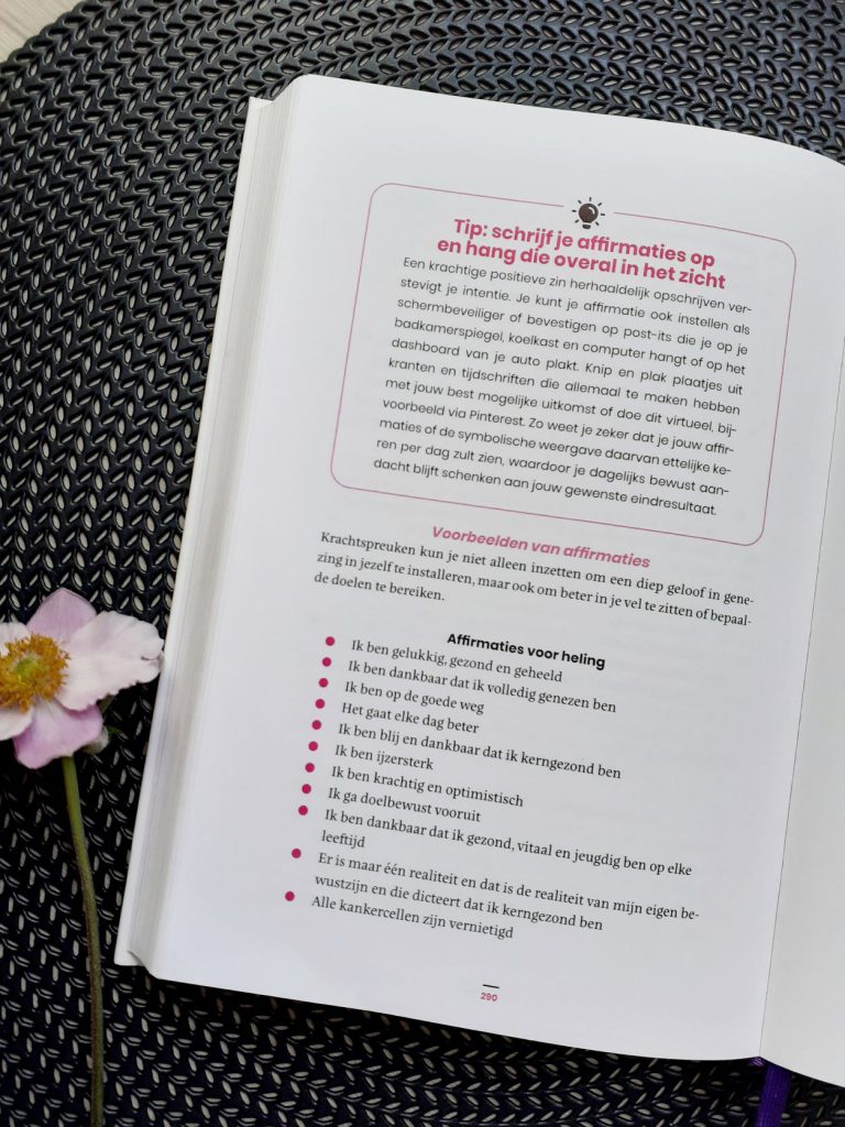 In deel 2 volgt een praktische handleiding hoe je zelfherstel van binnenuit kunt bereiken: optimaal integraal. Hierin staan aanbevelingen en tips van de schrijfster. Bijvoorbeeld hoe je kunt werken aan een positieve mindset en een rotsvast vertrouwen in je lichaam. Maar op 1 staat zelfzorg. Wees zacht en vriendelijk voor jezelf, neem regelmatig een massage en maak je huiselijke omgeving een veilig en opgeruimd toevluchtsoord. Ook belangrijk tijdens je ziekteproces is het creëren van een positieve realiteit. Geen google op bijwerkingen of doemscenario’s, maar voed jezelf met positief nieuws en positieve mensen om je heen. Want emotionele ondersteuning is ook bewezen bevorderend voor herstel.