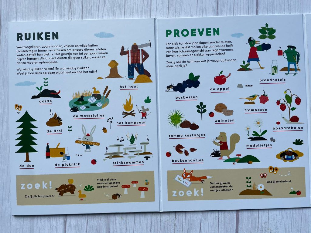 Wat wel heel leuk is gedaan in Zigzag het bos, is dat bij dit deel van de serie bij de opdrachtjes uitgegaan is van de zintuigen. Er zijn pagina’s met als onderwerp ruiken, proeven, horen en zien. De zoekopdrachtjes die erin staan sluiten bij het onderwerp van deze pagina aan. Ook kun je daar wat interessante weetjes vinden (zoals bijvoorbeeld het feit dat een slak wel drie jaar kan slapen zonder te eten).