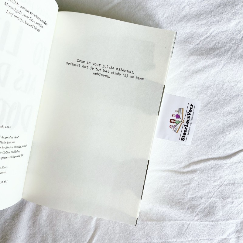 Het einde brak mijn hart en vond ik onbegrijpelijk en toch ook weer begrijpelijk. Maar gelukkig is daar de allerlaatste bladzijde… de drie puntjes waarmee Holly haar verhaal eindigt. Heel bewust, zoals ik lees in haar nawoord. Zo lief als de dood was een zeer verrassend derde deel. En eigenlijk smaakt het nog steeds naar meer. Ik kijk dan ook uit naar nog meer van deze wereld!